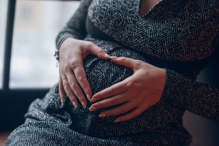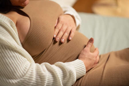 Close-up of pregnant female model holding belly. Woman in dress and cardigan sitting on bed. Pregnancy, expectation concept