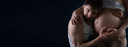 The husband knelt down in front of his wife and closed their eyes to her pregnancy belly. Ninth month of pregnancy. Unborn baby in the belly. Long photo frame.