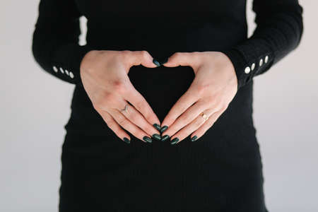 Pregnant woman in dress holds hands on the belly with black background