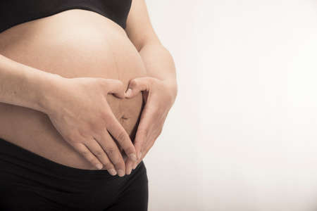 pregnant woman touching her belly drawing a heart with her fingers