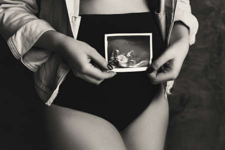 A pregnant woman in black underwear and a denim jacket holds an ultrasound image of the unborn child in her hands. She stands against the background of a black wall. Black and white photo.