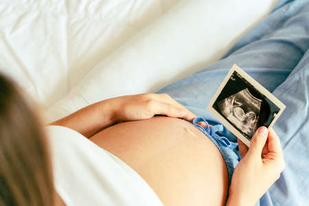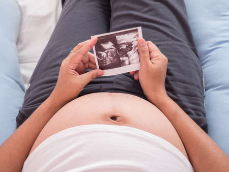 A pregnant woman is looking at an ultrasound photo of fetus. Mother gently touches the baby on stomach.Women are pregnant for 2-3 days or during the first trimester.