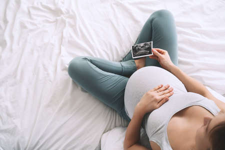 Pregnant woman touching her belly looking at ultrasound image in bed. Expectant mother with pregnant belly waiting for baby. Concept of pregnancy, gynecologic, healthcare.