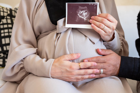 Pregnant Muslim Woman And Her Husband Holding Baby Sonogram Picture