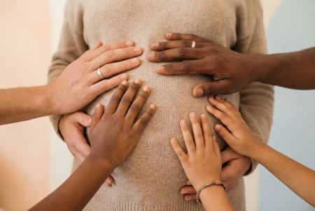 Pregnant womans belly with several hands from a diverse family, including adults and children, gently touching and supporting the unborn baby, symbolizing new life and hope