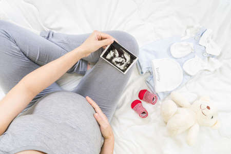 Top view of expecting pregnant woman in the bed with ultrasound scans and preparing baby clothes at home, boy or girl, pregnancy and birth concept