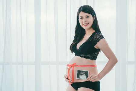 smiling pregnant woman with red ribbon on bare tummy and first photo of unborn child on white background. charming young motherhood face camera showing ultrasound scan picture and hug belly indoors