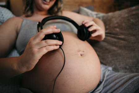 Close up of pregnant mom sitting on her sofa smiling listening to music .