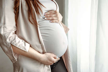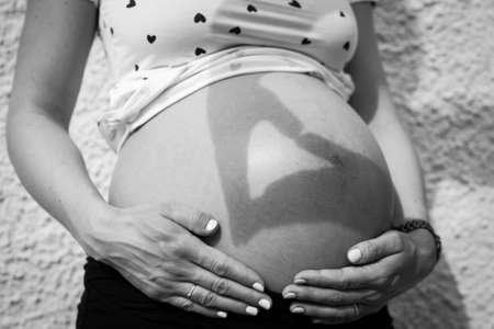Close-up of the belly of the expectant mother in the last months of pregnancy.