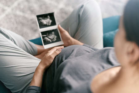 Top view cropped of pregnant woman with ultrasound photo of fetus standing at home, young future mom waiting child first baby, pregnancy and motherhood concept