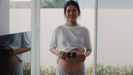 Happy Young Pregnant woman holding showing ultrasound scan photo. Smiling Asian Mother with sonogram of her unborn baby. Concept of pregnancy, Maternity prenatal care