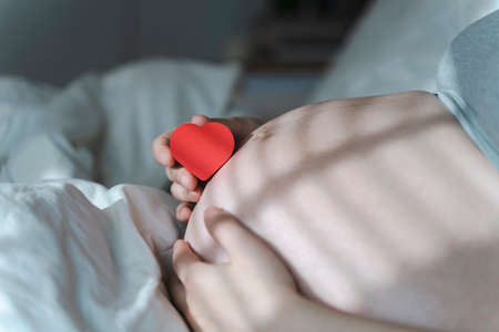 A pregnant woman after IVF holds a small red heart in her hands. The concept of motherhood, fertility, new life, In vitro fertilisation. Banner