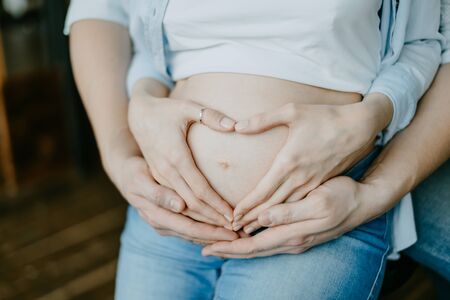 Fathers heart shape hands touching mothers pregnant maternity belly. Pregnancy concept. Parentness