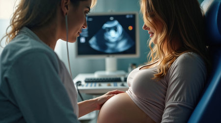 Gynecologist shows fetus to woman with ultrasound scan closeup