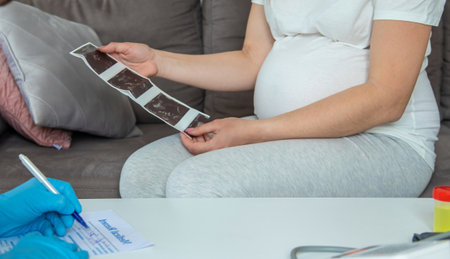 Pregnant woman looking at ultrasound scan of baby, close up of scan. Concept photo of pregnancy, pregnant woman, family, parenthood, motherhood.crop image - copyspace