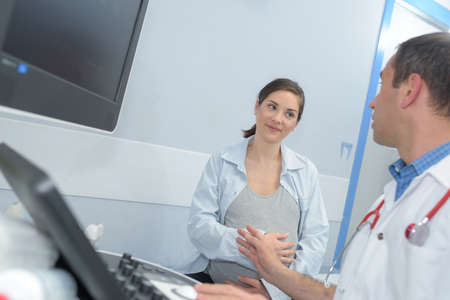Male doctor does ultrasound for a pregnant woman in the hospital.