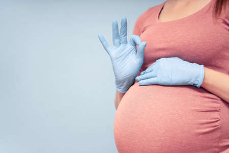 Yang woman show ok sign. Healthcare and Infection concept. Woman in Medical Face Mask and blue gloves against flu and viruses, copy space. High resolution.