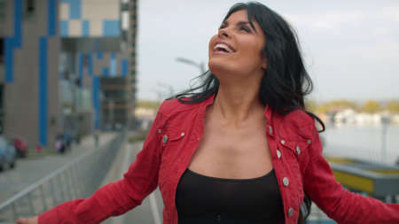 Close up portrait of laughing beautiful woman with long black hair standing next to a modern building. Girl in red jacket in the city. Real people