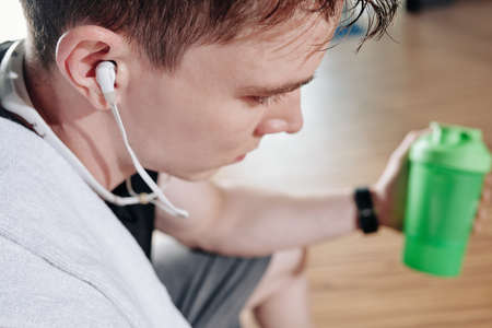 Tired sportsman wearing earbuds and listening to motivating encouraging words trainer when using workout mobile application in gym