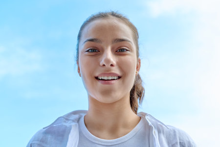 Happy teenage girl smiling with rhinestone teeth looking down at camera, blue sky