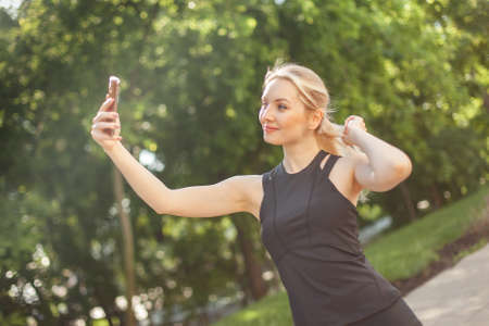 Young fit woman taking a selfie on the phone in the park