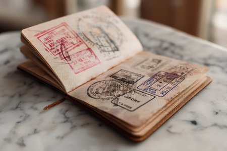 Travel passport opened to reveal a collection of vibrant stamps from various countries, resting on a polished marble surface highlighting past adventures.