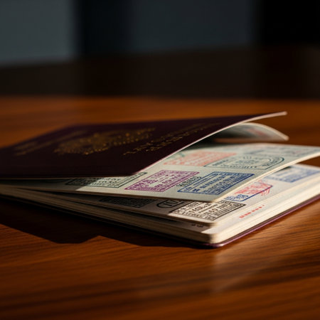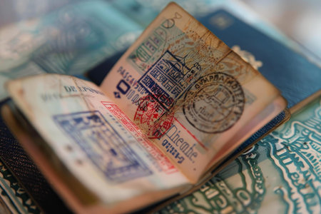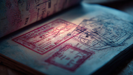 Open passport displaying colorful stamps from different countries, representing a journey full of cultural diversity and travel experiences.
