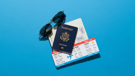 Close-up of passport, currency, sunglasses, smartphone, and palm leaf on desk, suggesting preparation for a journey. Travel essentials on textured surface. Travel vacation concept. Copy ad text space