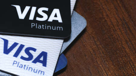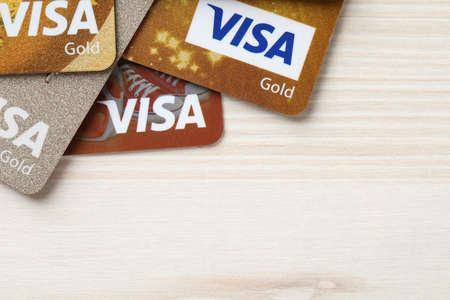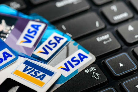 Moscow, Russia - August 05, 2017: Visa credit cards onr notebook keyboard
