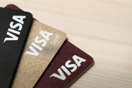 MYKOLAIV, UKRAINE - FEBRUARY 23, 2022: Bank cards of Visa payment system on wooden table, closeup