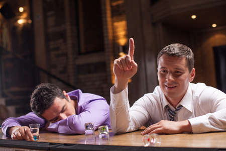 one young man sleeping on counter. two friends sitting in bar and drinking