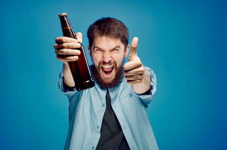 Man with a beard on a blue background holds a bottle of beer, alcohol.