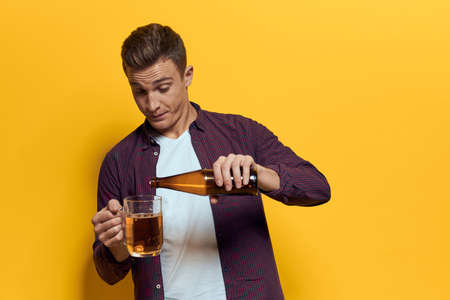 cheerful man mug of beer with bottle fun drunken lifestyle alcoholic yellow background