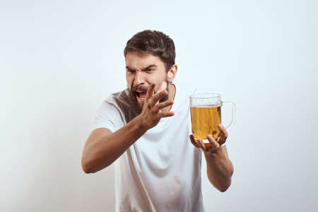 man with a mug of beer in his hands and a white t-shirt light background mustache beard emotions model