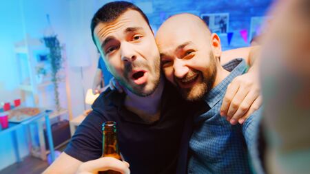 Two drunk friends drinking beer rest fun dark background