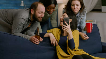 Group of mixed race people spending time together while looking at comedy video on phone.