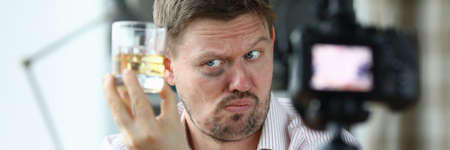 Portrait of man making face holding glass with alcoholic drink. Macro shot of male showing tongue. Videocamera filming on tripod. Beginner blogger concept