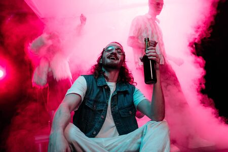 happy man in sunglasses with bottle of alcohol during rave in nightclub