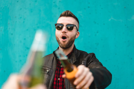 Bearded cool man toasting beer with best friend outdoor against a blue wall background - Hands of hipster man wearing leather jacket toasting with beer bottles - Friendship concept, focus on man face