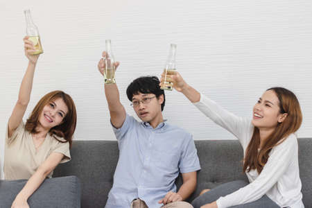 Group of happy Asian friends showing bottle of wine in living room.