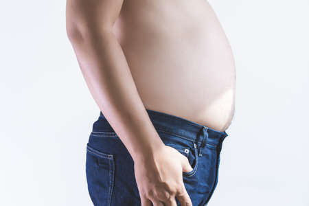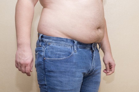 Man wearing blue jeans, fat belly closeup, the problem of overweight