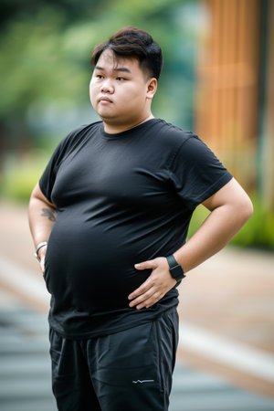Overweight Asian Man in Black Athletic Wear Holds Stomach with Discomfort Posing Outdoors.