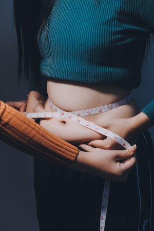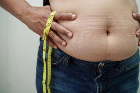 fat woman, fat belly, chubby, obese woman hand holding excessive belly fat with measure tape, woman diet lifestyle concept