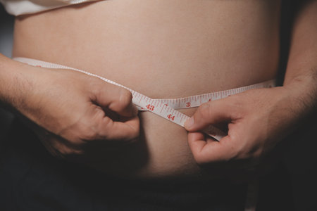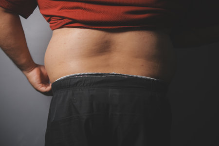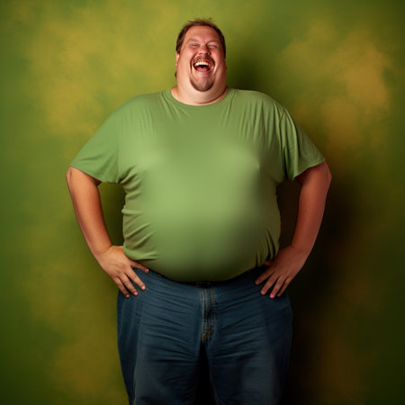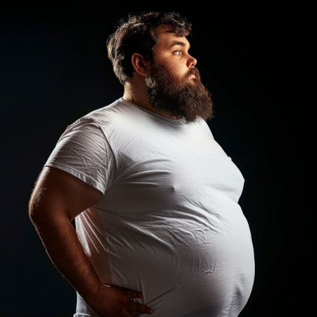 Health awareness: Closeup of overweight man in tight shirt, highlighting the importance of self-care and embracing body positivity