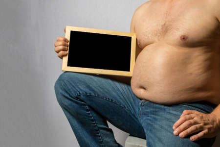 An Overweight Shirtless Caucasian Man Sitting Down Holding A Blackboard