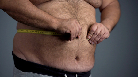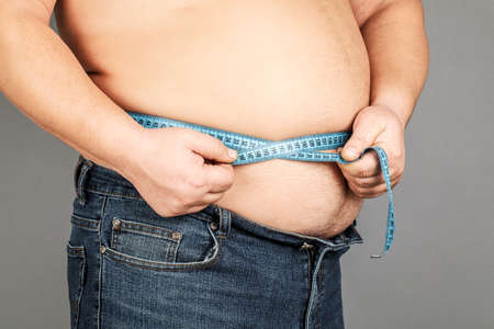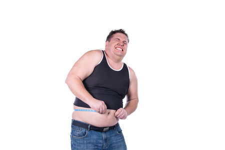 Sad overweight man unable to measure his waist fat tummy with stretch marks