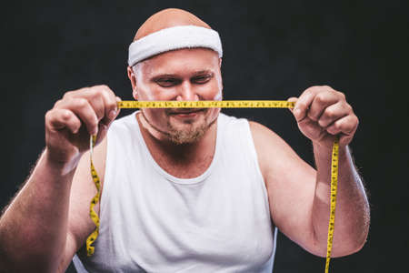 Happy plump man in a white t-shirt looks at a measuring tape in his hands with a big smile