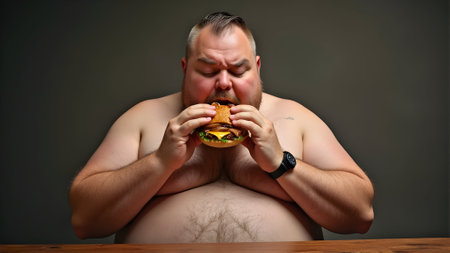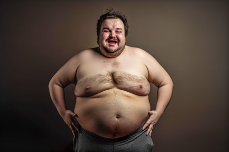Fat man with big breasts on a gray background. The concept of overweight and healthy lifestyle. Generative AI.