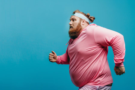 Plump man in sportswear at jogging workout on asphalt path on the city street. Fat man Improves physical health burning fat with thirst to lose weight. Active lifestyle and monitoring appearance