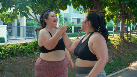 Obese two young asian woman doing stretching arm muscle in the park, woman with overweight warm up and exercise for dieting and health while handshake, oversized and workout, plus size.
